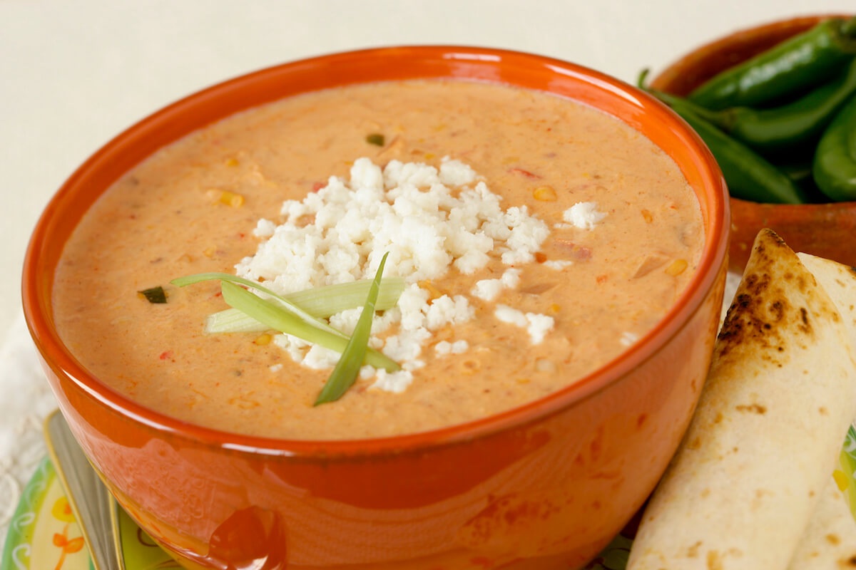 - Remove from heat and carefully purée in blender or food processor until almost smooth, leaving mixture somewhat chunky. Add remaining stock and Crema Mexicana. Return to heat and simmer for 5 minutes. Remove from heat and ladle into bowls. Garnish with Queso Fresco and cilantro.