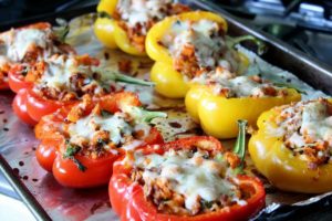 - Preheat oven to 350F. Wrap a baking sheet in foil and set aside. Lightly brush the outside and inside of each pepper with olive oil and set aside.