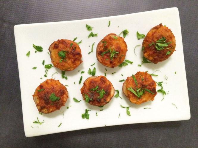 - Once potatoes are cool enough to touch, cut them in half and use a small spoon to scoop the middles out so you have little potato skin boats.