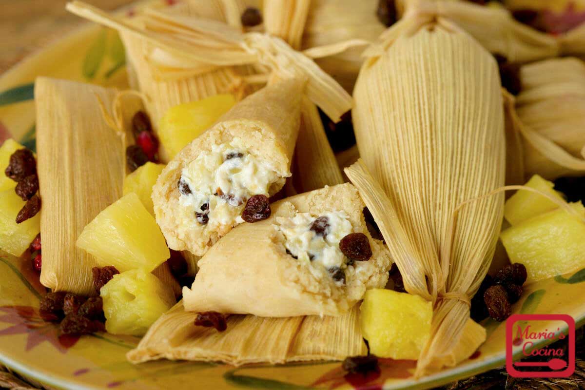 - To make the tamales prepare one husk at a time by placing the husk on your open palm, smear 3 tablespoons of tamale dough on the husk, from side to side and all the way to the bottom, leaving 3 inches of the top of the husk untouched for folding. Add 1 spoonful of pineapple/raisin mixture in center of dough and bring sides of corn husk together. Fold 1/3 of the husk to the left, fold 1/3 to the right, overlapping, pinch the bottom to seal and gently fold over the top to create a small rectangle.