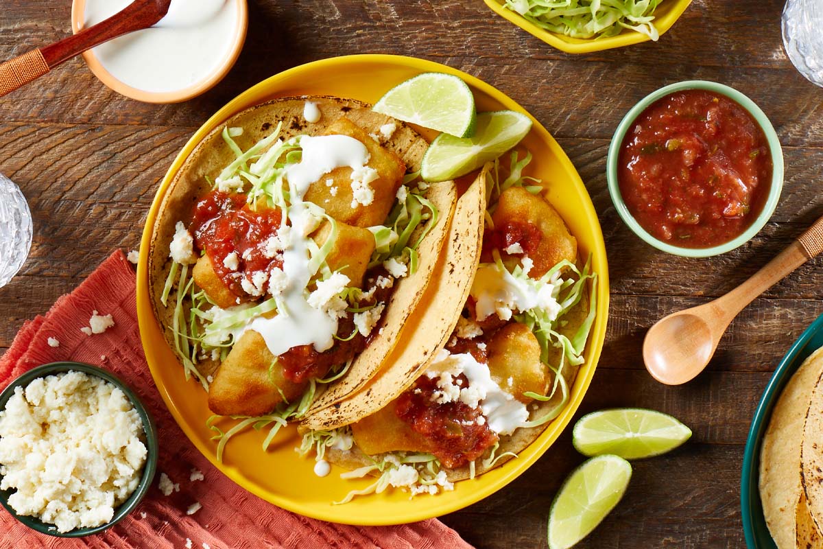 - Place a piece of cod on a tortilla, top with shredded cabbage, Queso Fresco crumbles, Homestyle Salsa, a drizzle of Crema Mexicana and a squeeze of lime. Serve immediately.