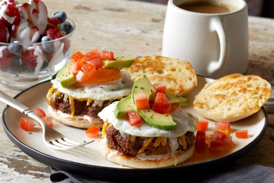 - Place a Chorizo patty on the bottom of each muffin then top each patty with Cacique Four Quesos Blend Shredded Cheese, allowing it to melt slightly from the heat of the patty. Add a cooked egg on top of the cheese, a layer of avocado slices and top with tomatoes.