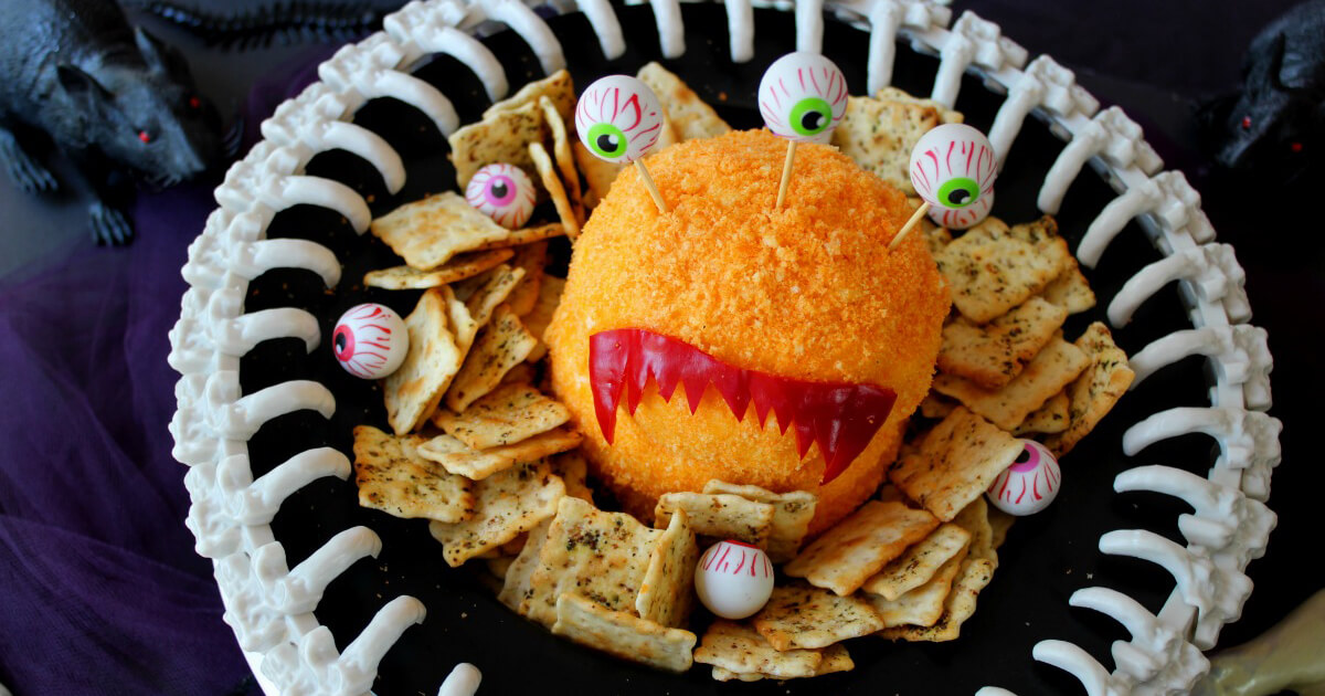 - Decorate with edible eye ball candies by pressing them into the cheese monster, or sticking them on toothpicks. Cut and shape teeth/fangs made with red bell peppers or other edible veggies with scissors and attach with toothpicks. Serve with crackers. Place the platter as the centerpiece on your buffet and watch as your waif-like witches turn into hungry beasts and devour every bite.