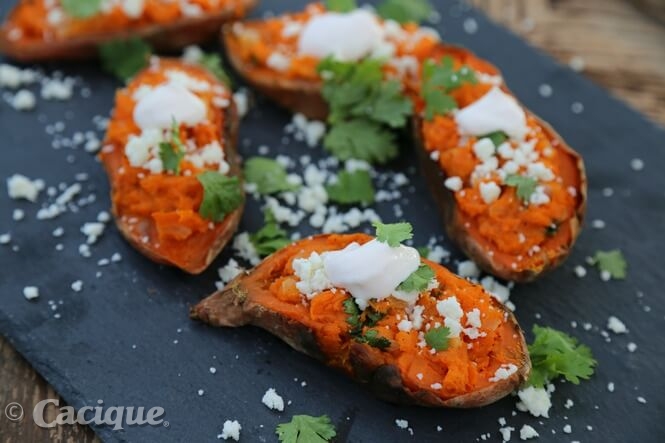 - Pre-heat oven to 375 degrees. Place sweet potatoes on a baking sheet and lightly prick each with a fork. Bake for 40 minutes or until potatoes are tender. Remove from oven and carefully slice each potato in half and with a spoon scoop out the cooked potato flesh into a large bowl. Mash warm sweet potato flesh along with sautéed onions, butter, crema and 3 tablespoons guajillo sauce until smooth. Season to taste with salt and pepper and add additional guajillo sauce if desired and stir in beaten egg. Scoop mixture back into sweet potato shells, return to oven and bake an additional 10 minutes. Serve warm topped with crumbled queso fresco, cilantro and crema.