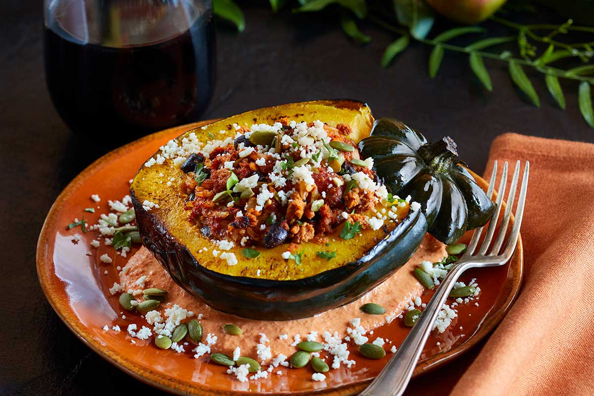 Whole-Roasted Acorn Squash With Chorizo And Red Pepper Crema