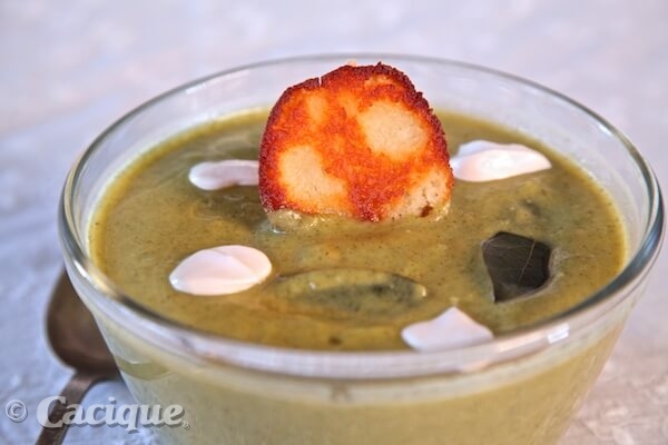 - Remove zucchini/broth from the flame, and remove the bay leafs from the pot reserving them on the side. Pour the zucchini/broth into a blender and add in Cacique® Crema Salvadorena. Blend until smooth.